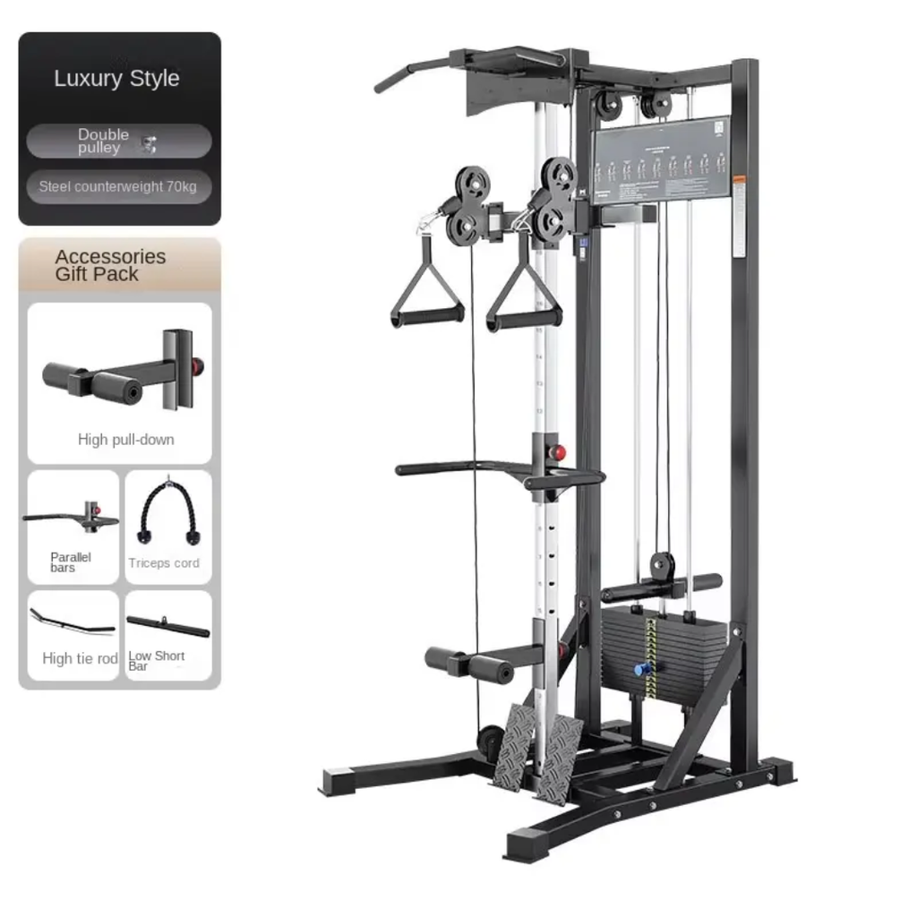 Dual pulley system: Adjustable high and low pulleys for a wide range of exercises (lat pull, cable crossover, rows, triceps, etc.)